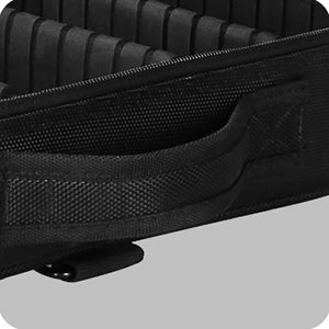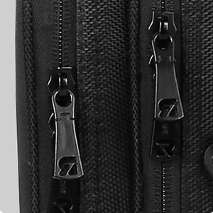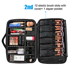 The second layer has 12 elastic makeup brush pockets with cover, 1 zipper pocket. The bottom compartment is designed with an adjustable divider.