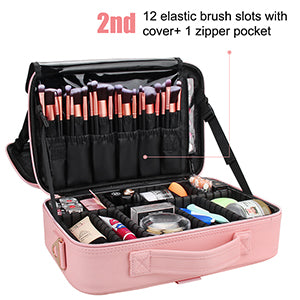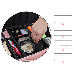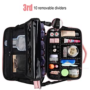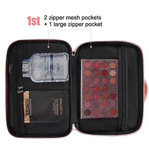 • ADJUSTABLE COMPARTMENTS AS NEEDED: The Travel Makeup Case with adjustable dividers, can adjust the divider to fit the cosmetics. Three large zipper pocekts for the large palettes or cosmetic tools.